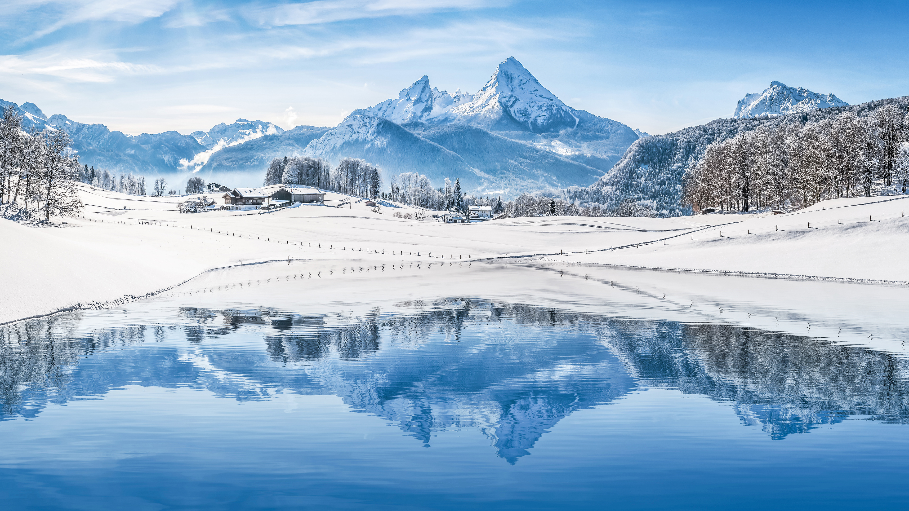 The crisp winter air settles above the snow-covered mountain landscape of the Bavarian Alps, located in Germany"s southern region and continuing across the border into Austria. Its snowy peaks are reflected in the smooth mirror of the frozen lake, giving the impression of harmonious silence and tranquility—which might be interrupted by the soft crunch of the snow under the footsteps of hikers or travellers. Today, Southern Bavaria has become a well-known destination for skiing and snowboarding enthusiasts.