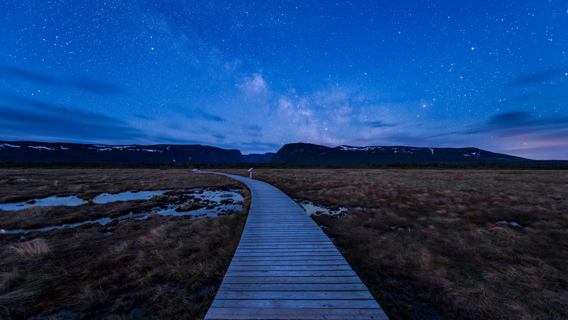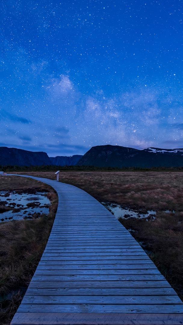 A starry night! Boardwalk on hiking trail to Western Brook Pond in Gros Morne National Park (© Cavan Images - Offset/Shutterstock)