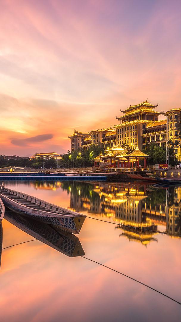端午节安康 广角镜头下的厦门龙舟池,日落的光洒在传统龙舟上,中国 (© Sen Li/Getty Image)
