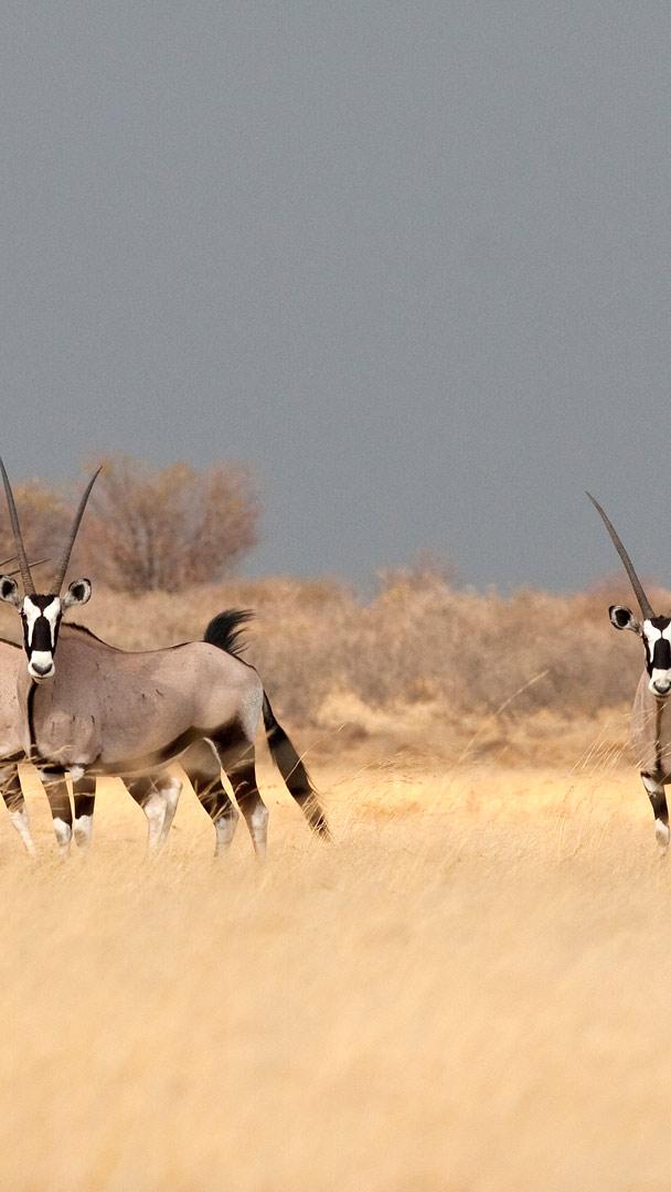 Hörner hoch, Ohren gespitzt! Das heutige Bild zeigt eine Gruppe von Spießböcken, einer großen Antilope, die über die ausgedehnten Savannen im südwestlichen Afrika herrscht. Sie sind in den Trockengebieten von Botswana, Namibia, Südafrika und Teilen von Simbabwe beheimatet und leben vor allem in der Kalahari- und Namibwüste. Sie können unter extrem trockenen Bedingungen überleben und wochenlang ohne Wasser auskommen, da sie die Feuchtigkeit aus ihrer Nahrung aufnehmen. Außerdem sind Spießböcke geschickte Läufer, die eine Geschwindigkeit von bis zu 60 km/h erreichen können. Ihr Markenzeichen sind die auffallend länglichen, geraden Hörner. Obwohl beide Geschlechter diese gewaltigen Abwehrkräfte besitzen, sind die Hörner der Weibchen etwas länger und schlanker, während die Hörner der Männchen dicker sind und eine breitere Basis haben. Wenn Sie sich also jemals in den sandigen Ebenen der Kalahari aufhalten, halten Sie Ausschau nach diesen tierischen Wüstenjuwelen.