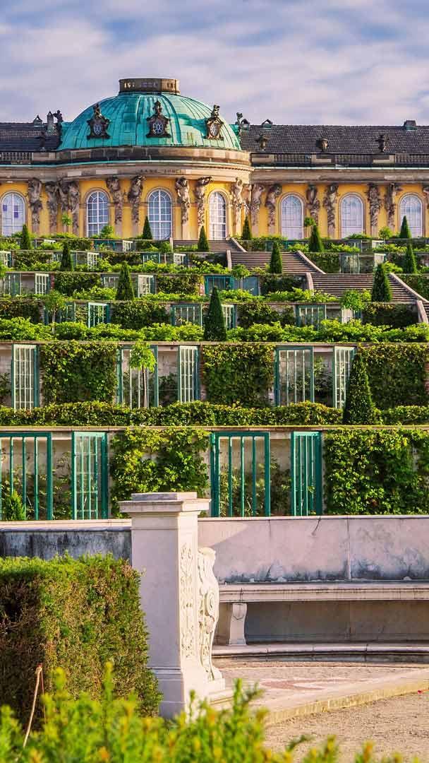 Schloss Sanssouci und sein Park in Potsdam auf unserem heutigen Bild sind nicht nur ein Juwel preußischer Architektur, sondern auch ein beeindruckendes Beispiel höchster Gartenkunst. 1990 nahm die UNESCO den Park 1990 in die Liste des Weltkulturerbes auf. Der Bau des Schlosses begann 1743 auf Wunsch von Friedrich des Großen. Das Schloss bietet mit seiner einzigartigen Terrassenanlage, die dem Weinbau gewidmet ist, einen spektakulären Ausblick über Potsdam. Friedrich der Große plante das Schloss als Sommerresidenz und ließ sich dort auch seine letzte Ruhestätte anlegen. Im 19. Jahrhundert erweiterte König Friedrich Wilhelm IV. den Garten erheblich. Er integrierte einen malerischen Landschaftspark und fügte faszinierende Naturinszenierungen sowie prachtvolle Bauten des Klassizismus und der Romantik hinzu.
