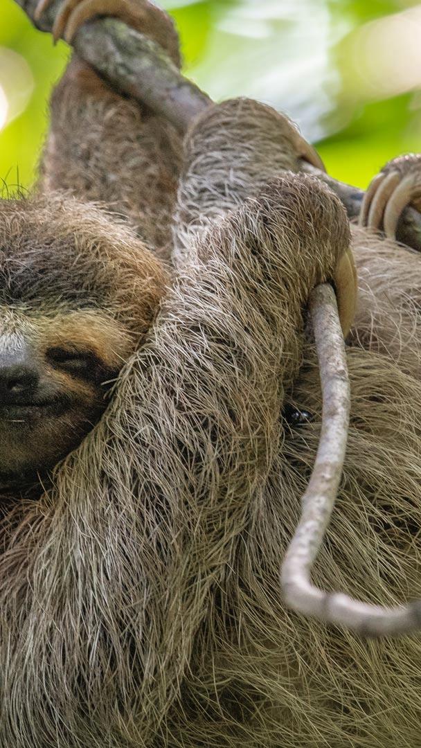 Heute feiern wir den Internationalen Tag des Faultiers! Der Hauptdarsteller unseres heutigen Bildes ist das Dreizehenfaultier, hier auf einem Baum in Costa Rica abgelichtet. Dieses entspannte, baumliebende Säugetier ist in den tropischen Regionen Süd- und Mittelamerikas zu Hause. Diese faszinierenden Tiere haben kurze Schwänze und drei Zehenkrallen an jedem Glied, mit denen sie sich mühelos an Ästen festhalten können. Faultiere ernähren sich hauptsächlich von Blättern, fressen aber auch Früchte und Baumsäfte. Um die zähen, faserigen Blätter zerkleinern zu können, haben sie einen speziellen Mehrkammermagen. Ihr Stoffwechsel ist sehr langsam, was bedeutet, dass die Verdauung sehr lange dauert und sie nicht viel Nahrung pro Tag benötigen, um zu überleben.