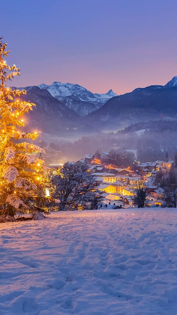 Frohes Fest! Weihnachtsbaum bei Berchtesgaden mit dem Watzmann im Hintergrund, Bayern (© Günter Gräfenhain/eStock Photo)