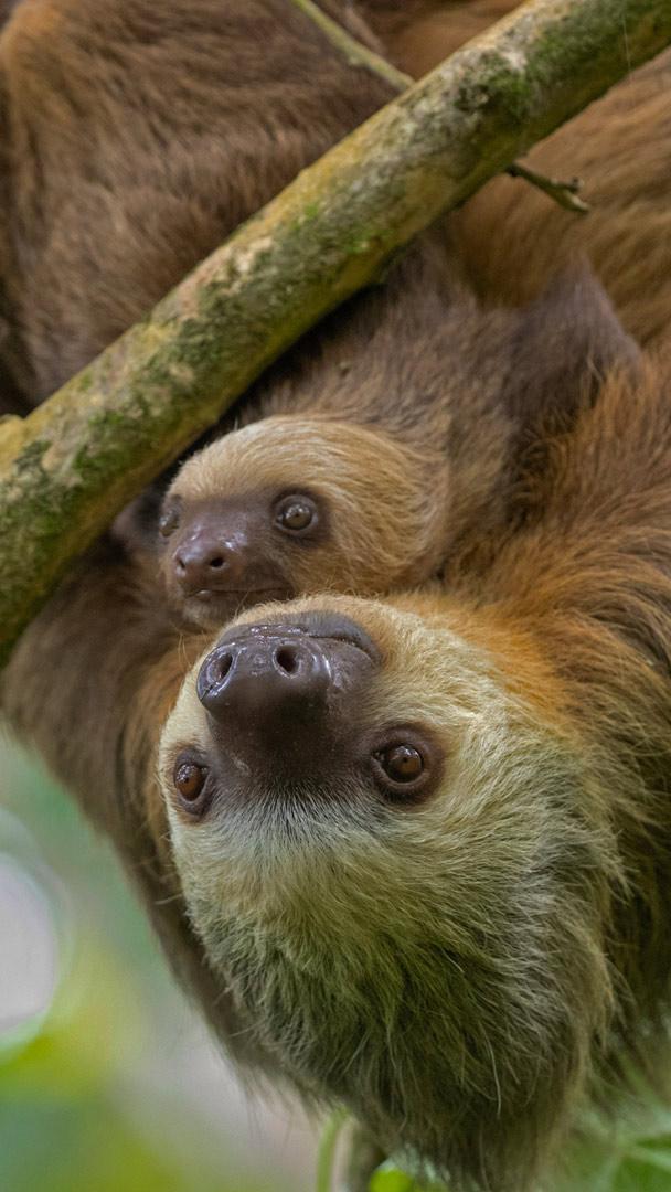 Gemeinsam abhängen Hoffmann-Zweifingerfaultier-Weibchen mit seinem Jungen, Puerto Viejo de Talamanca, Provinz Limon, Costa Rica (© Suzi Eszterhas/Minden Pictures)