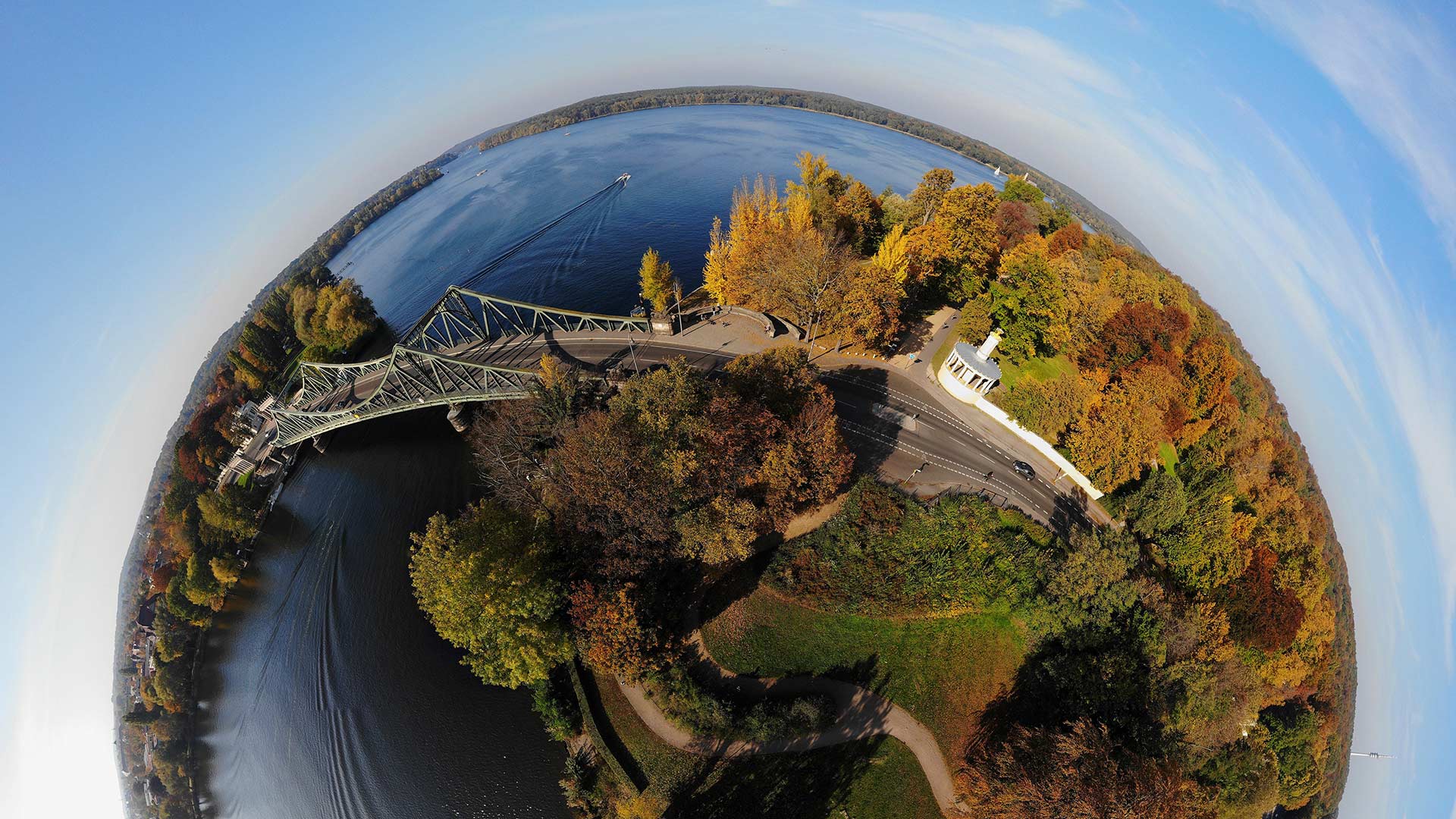 Symbol der Teilung und der Einheit Kugelpanorama-Luftbild (Little Planet) der Glienicker Brücke, Potsdam, Brandenburg (© 360b/Alamy)