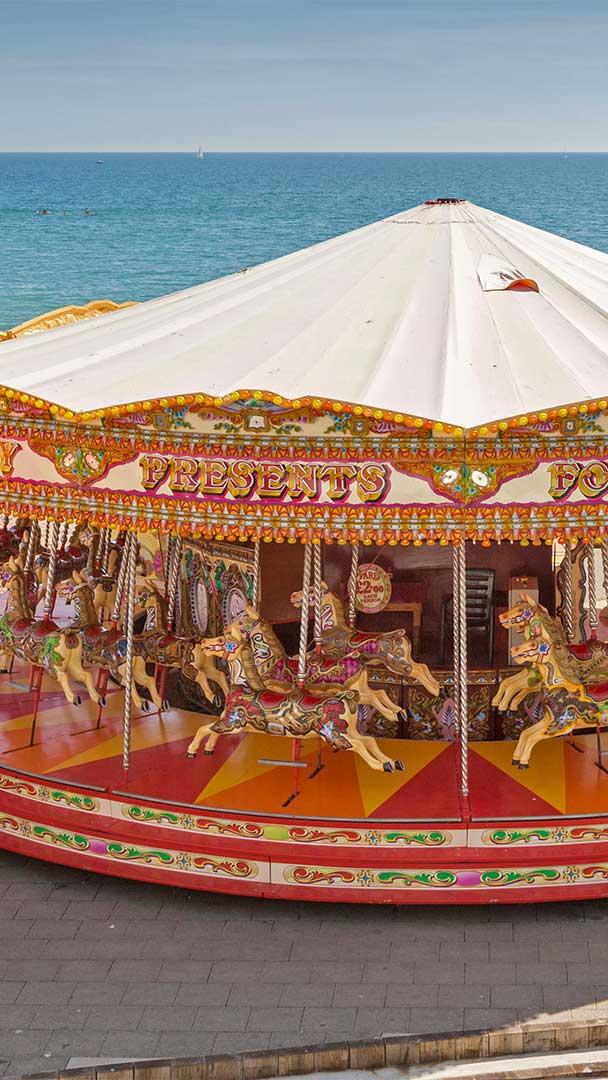 Nostalgie an der Strandpromenade „Golden Gallopers Carousel“ an der Strandpromenade in Brighton, East Sussex, England, Vereinigtes Königreich (© Graham Prentice/Alamy)