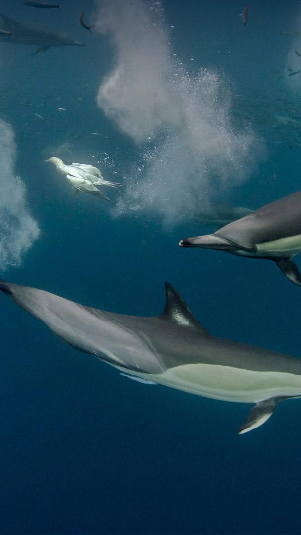 Das Buffet ist eröffnet Langschnäuziger Gemeiner Delfin und tauchende Kaptölpel bei der Jagd auf Pazifische Sardinen vor dem Ostkap, Südafrika (© Pete Oxford/Minden Pictures)