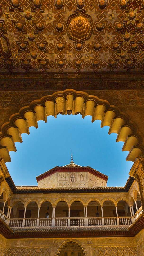 Partez à la découverte d’un véritable joyau andalou : l’Alcázar royal de Séville, témoin de la splendeur de l’Espagne islamique. En 1248, sous l’influence chrétienne, cette ancienne forteresse a été transformée en un chef-d"œuvre du style Mudéjar, qui fusionne harmonieusement les formes islamiques et le savoir-faire local. On y admire notamment le Patio de las Doncellas, dont le bassin reflète une architecture raffinée, ornée de symboles protecteurs, comme la Main de Fatima, et de calligraphies arabes. Les murs sont décorés de magnifiques azulejos, des céramiques aux motifs géométriques complexes. À l’extérieur, les jardins, avec leurs fontaines et allées bordées d’arbres, offrent un havre de paix, parfait pour se rafraîchir à l’abri de la chaleur andalouse.