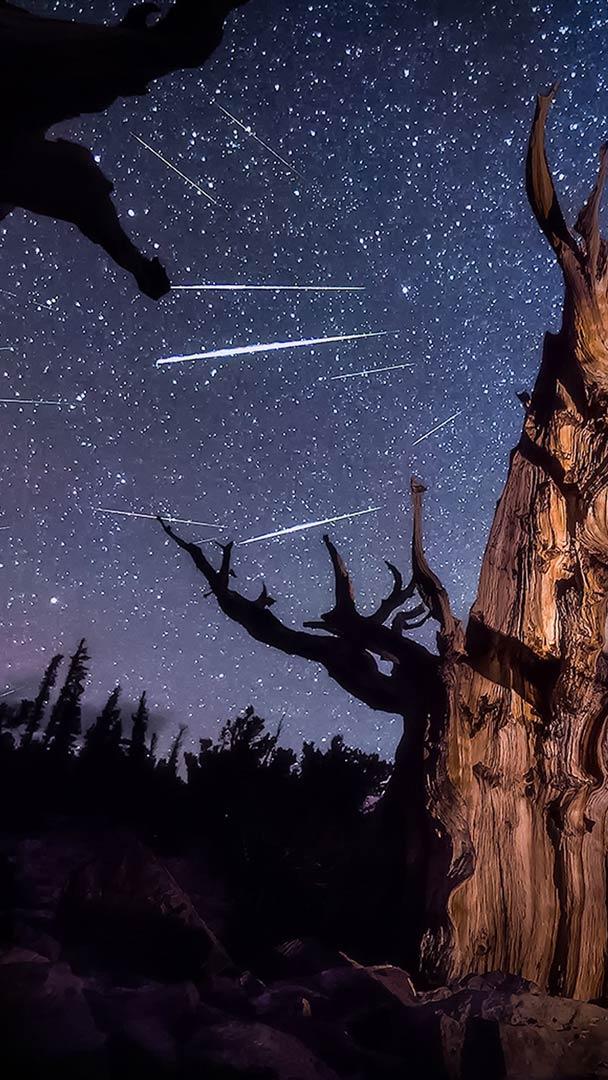 Sous le ciel profond du Nevada, aux États-Unis, un pin Bristlecone tordu par les siècles, semble contempler les cieux. Ce soir, il assiste une fois encore à un spectacle qu’il connaît bien : les Perséides, la célèbre pluie d’étoiles filantes du mois d’août.