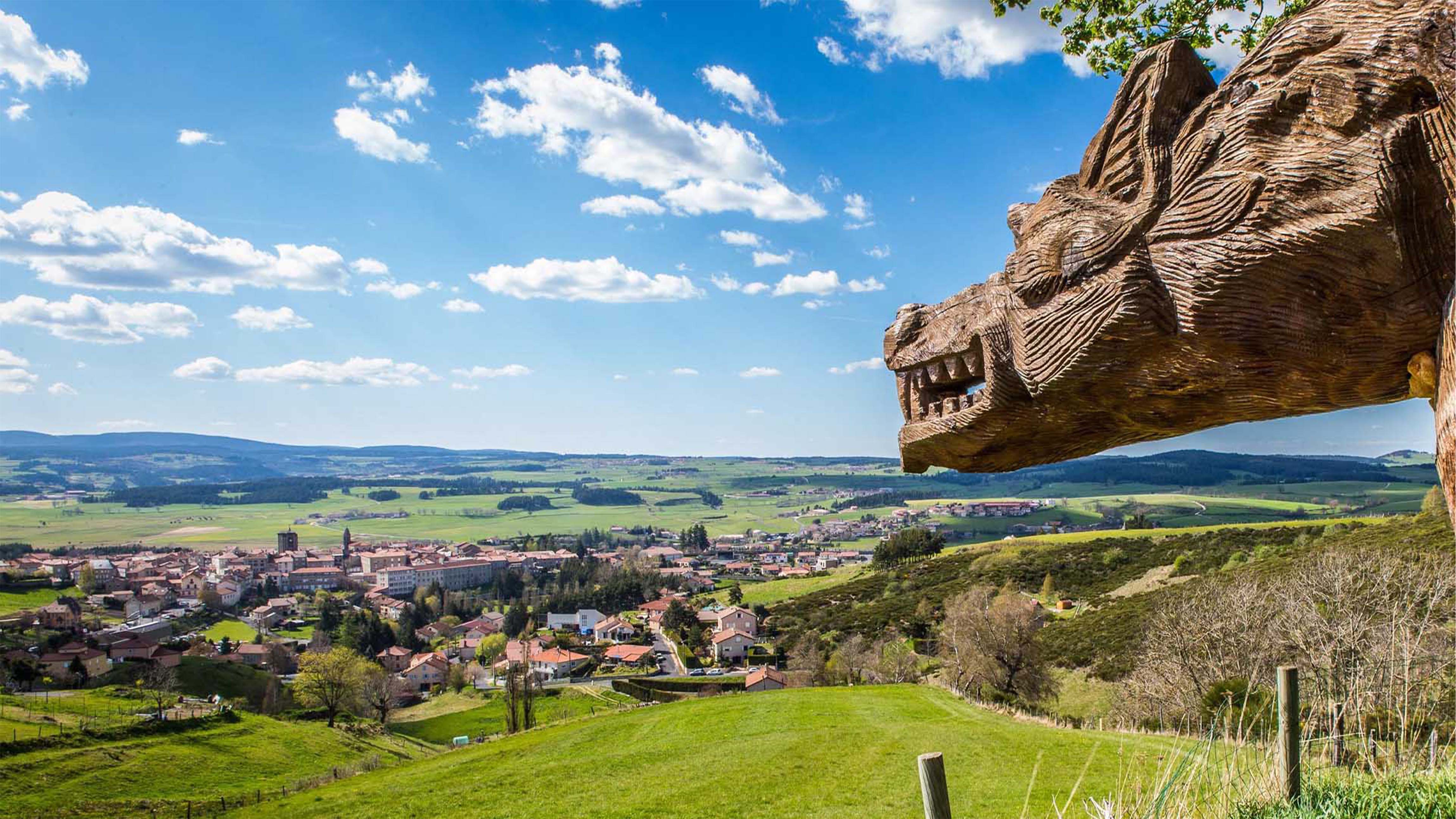 La bête veille sur la vallée Saugues et de sa sculpture en bois de la bête du Gevaudan, Haute-Loire (© Gautier Stephane/Alamy Stock Photo)