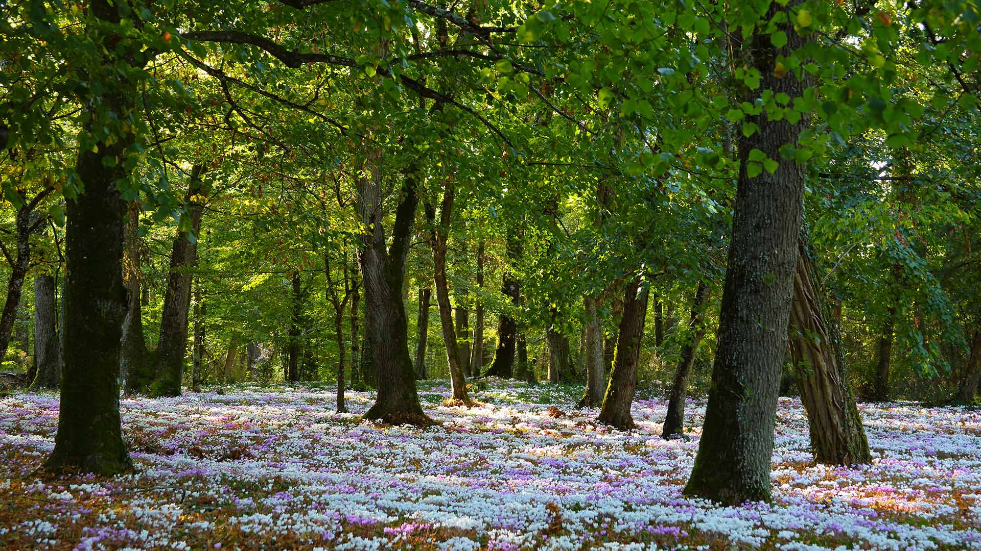 Bye-bye l’été Soleil traversant les arbres d’une forêt tapissée de cyclamens roses et blancs en Bretagne (© Rosemary Calvert/Getty Images)