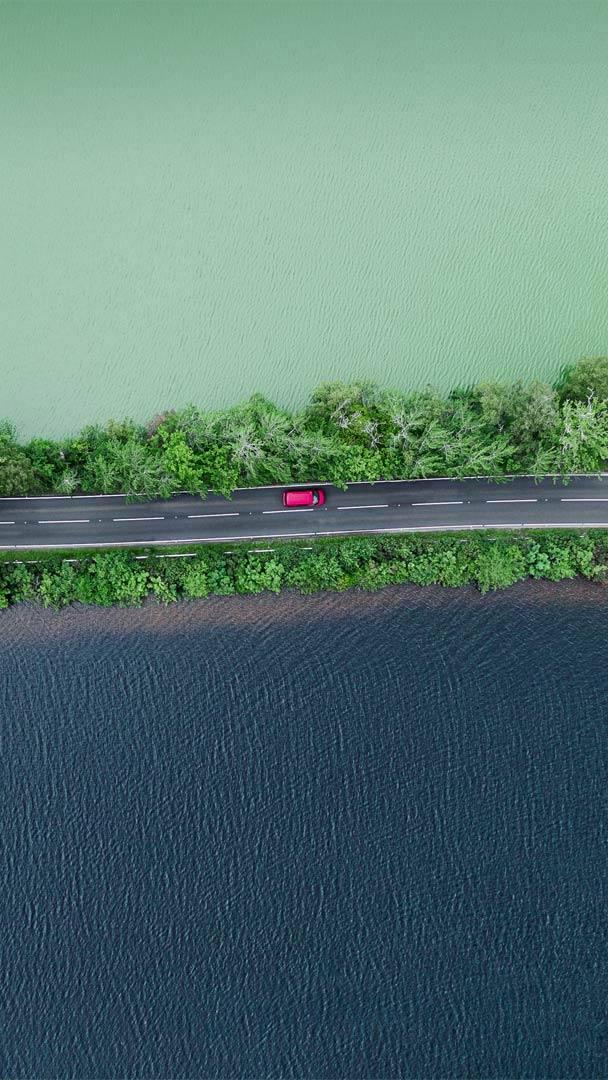 À mi-chemin Vue aérienne d’une route séparant deux lacs dans les Highlands dÉcosse (© Abstract Aerial Art/Getty Images)