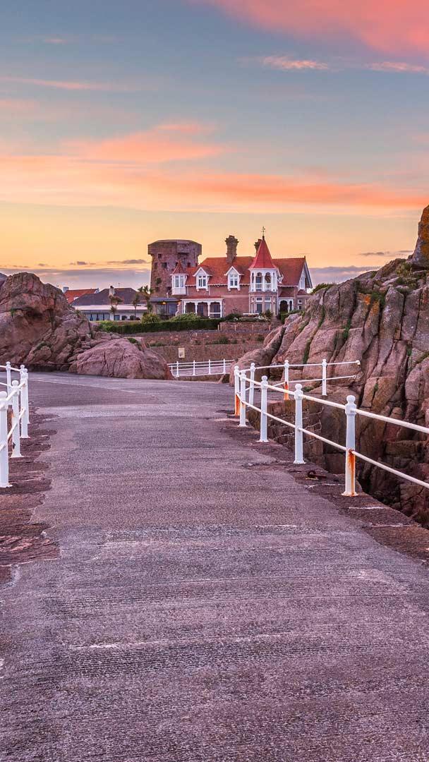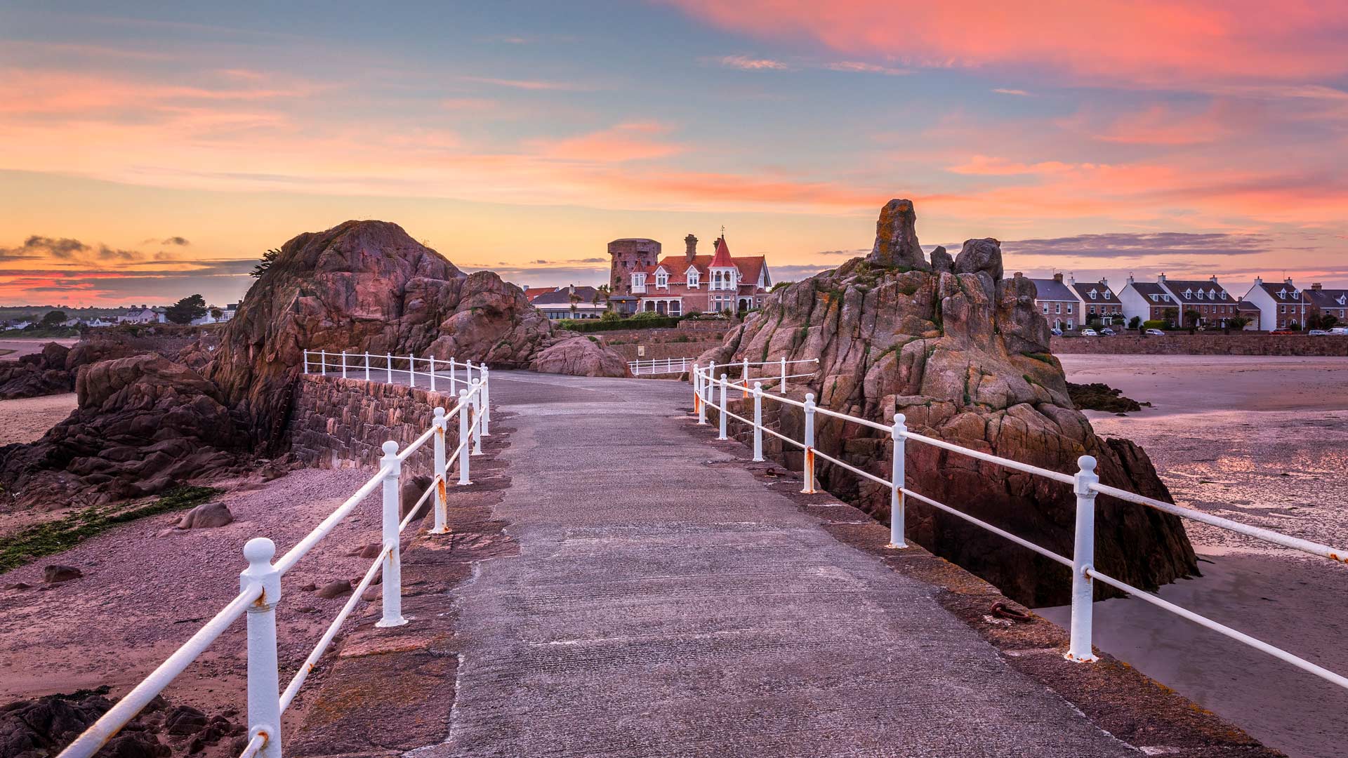 Just off the coast of Normandy, France lies Jersey, a British island with a Norse name. Found on the southeastern shore of the island is La Rocque Harbour, home to a white, sandy beach and an elevated walkway that stretches out into the water. The shoreline"s granite and plutonic rocks, which originated more than 420 million years ago, showcase a variety of colours and textures. Visible from the harbour are the round, stubby Icho Tower and the taller Seymour Tower, built in the 18th and 19th centuries respectively as coastal defence structures. Both structures are over 550 metres away from the shore and can be reached on foot with a sturdy pair of shoes, but only on the days of the year when the tide is lowest.
