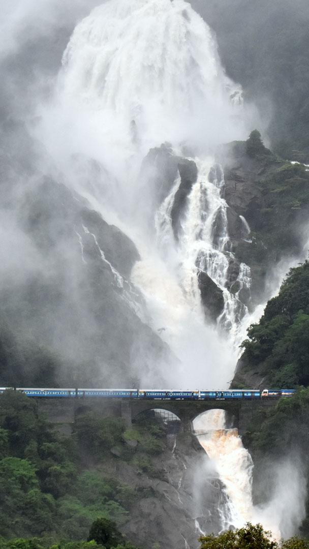 Today, let"s explore the magic of Dudhsagar Falls in Goa. Towering at an impressive 310 metres with a 30-metre width, it is among India"s tallest waterfalls. Translating to "Sea of Milk," it is a spectacular four-tiered waterfall on the Mandovi River. Legend has it, a beautiful princess would take a bath here and then drink sweetened milk from a golden jug. One day she saw a handsome prince watching her. To protect her modesty, she poured the milk, forming a white curtain as a shield. According to the tale, the milk continues to flow down the mountains as a tribute to her grace and virtue. This gem in the Western Ghats marks the journey of the Mandovi River as it falls toward Panaji and finally meets the Arabian Sea. During the dry season, the falls might seem unassuming, but with the arrival of the monsoon, they transform into a magnificent cascade of thundering water.