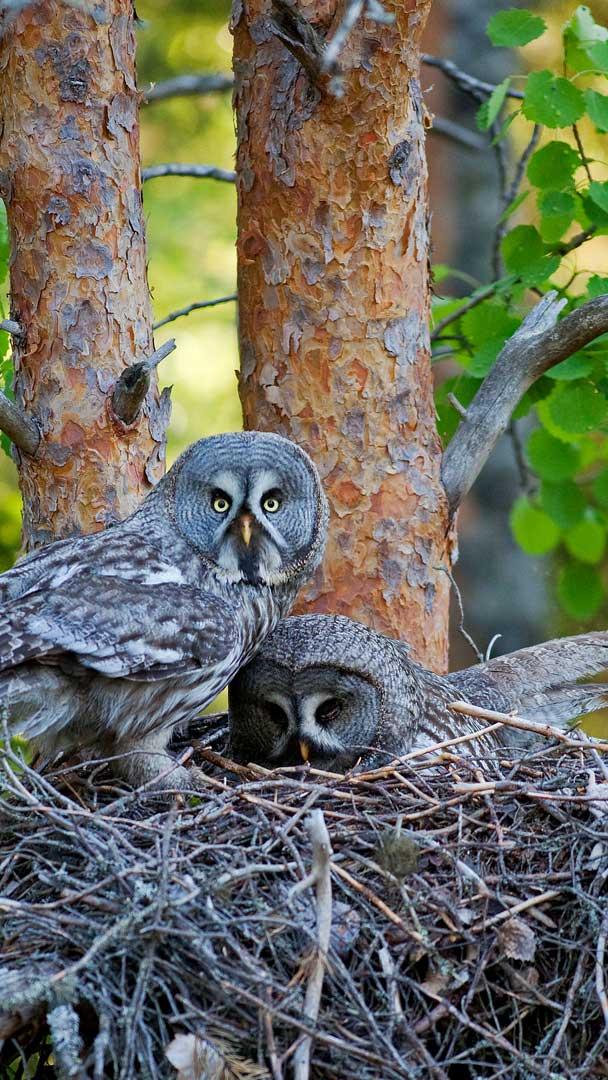 Great grey owls in their nest, Finland © imageBROKER.com/Alamy Stock Photo