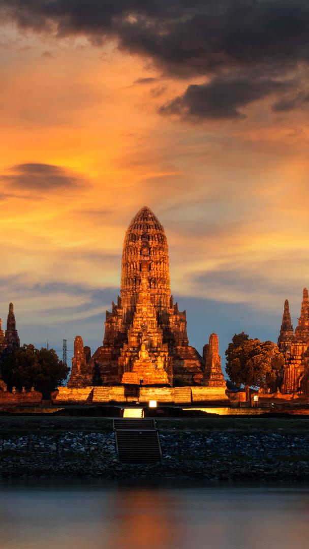 When the sunset casts its spell over Thailand, the Wat Chaiwatthanaram Buddhist temple lights up to welcome the night at the Ayutthaya Historical Park. Even though the temple is not part of the nearby Historic City of Ayutthaya (a UNESCO World Heritage Site), the ruin is just as divine, exhibiting meticulous details of rich history and architecture. King Prasat Thong - from the dynasty of the Siamese Ayutthaya Kingdom that ruled Southeast Asia between the 14th and 18th centuries - built the sanctuary to symbolise the center of the universe and connote his aspiration to become the future Buddha. From the Buddhist temple, the Historic City of Ayutthaya can be reached by boat or road. Three rivers link the once-metropolitan city of the Siamese Kingdom to the sea. Now a historical ruin, Ayutthaya was an important point of commerce and diplomacy, with the advantages of the surrounding rivers serving as natural defense.