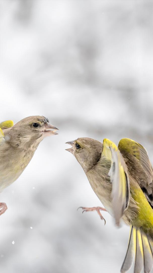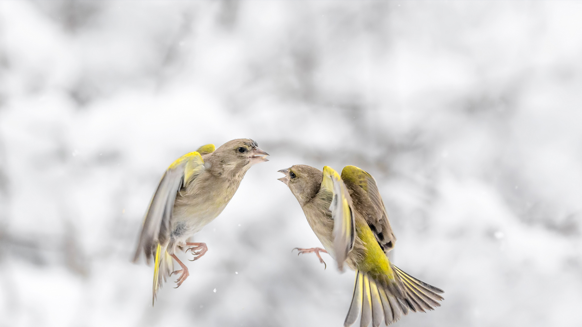 Questo posto è mio! Due verdoni che litigano mentre nevica, Italia (© Paolino Massimiliano Manuel/Getty Images)