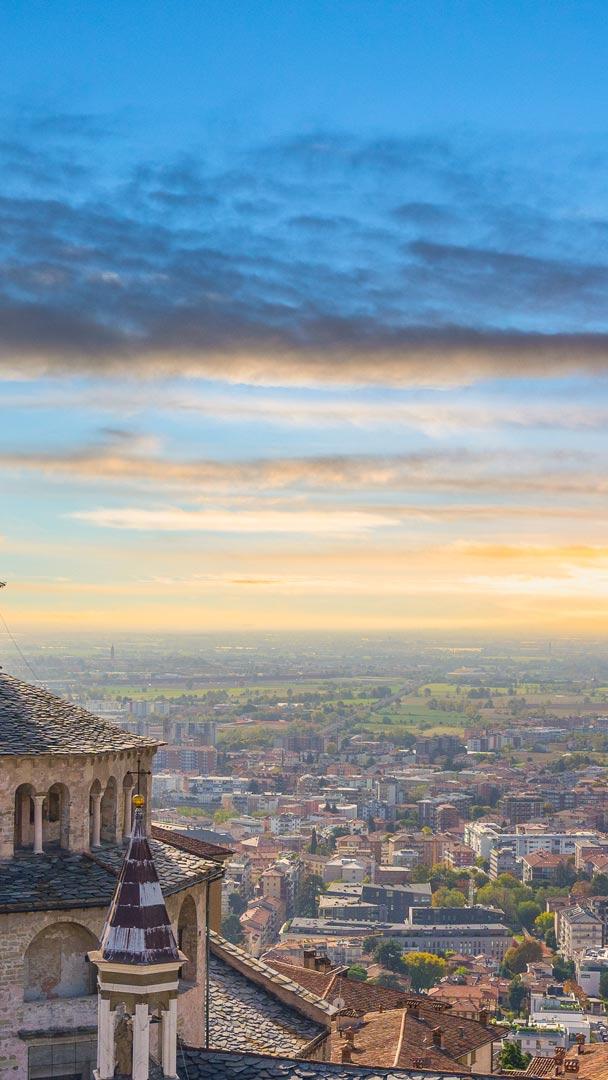 Che vista e che magnifica torre! Vista di Bergamo Alta durante il tramonto, Lombardia, Italia (© Deimagine/Getty Images)