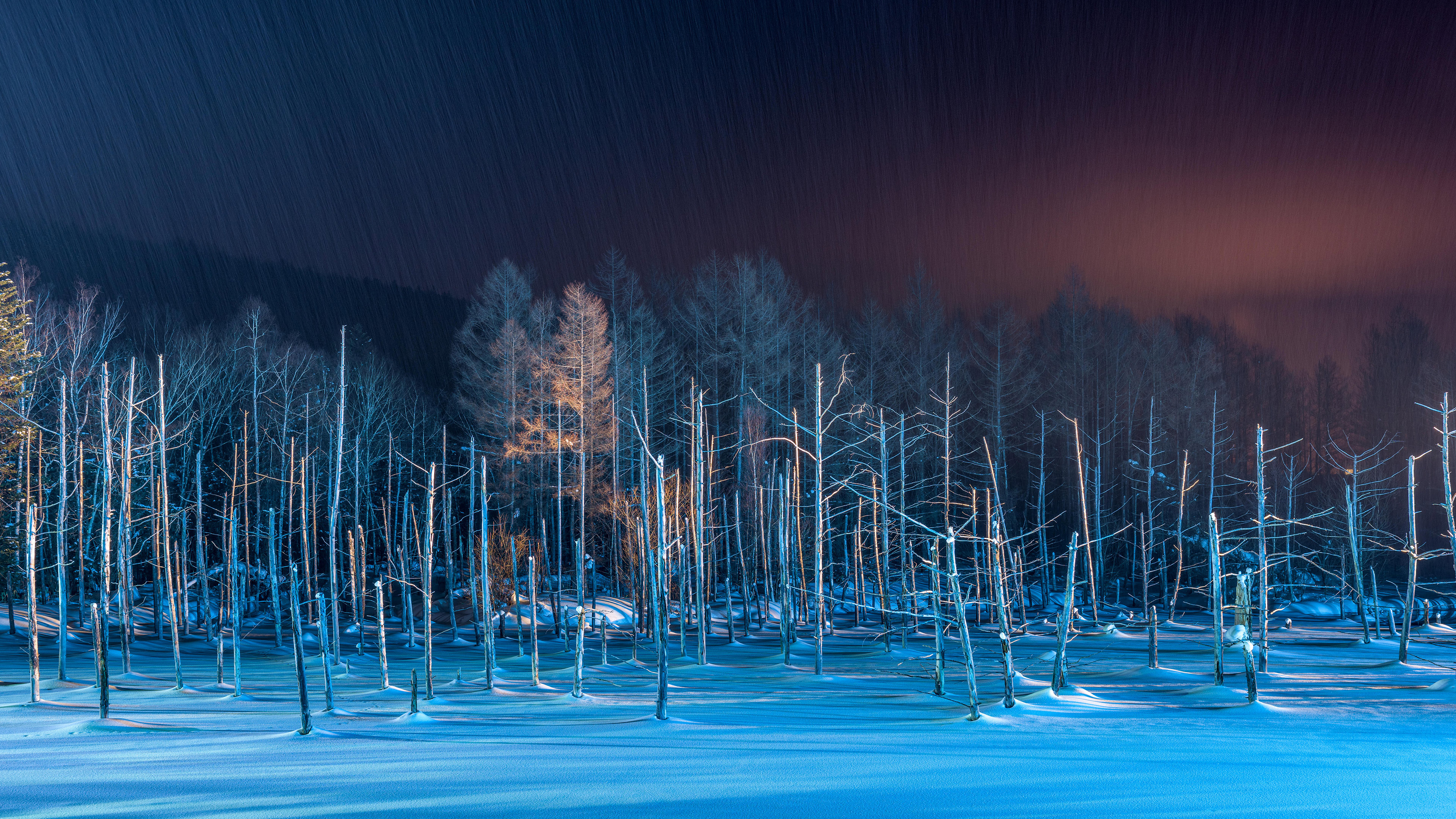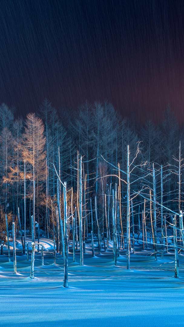 今日 12 月 21 日は一年で最も日が短い「冬至」です。季節の変わり目であり、寒さが一層厳しくなる時期でもあります。ここ、北海道美瑛町の「青い池」では、ライトアップにより、雪に埋もれた池と立ち枯れたカラマツが静かに浮かび上がります…