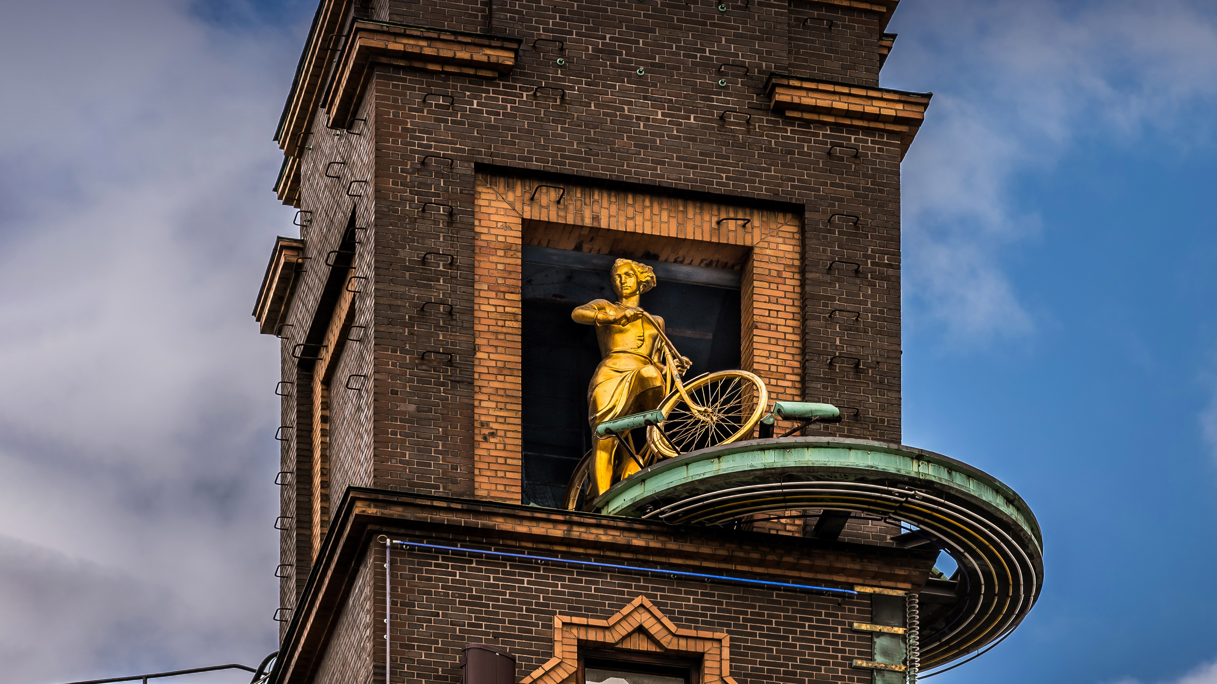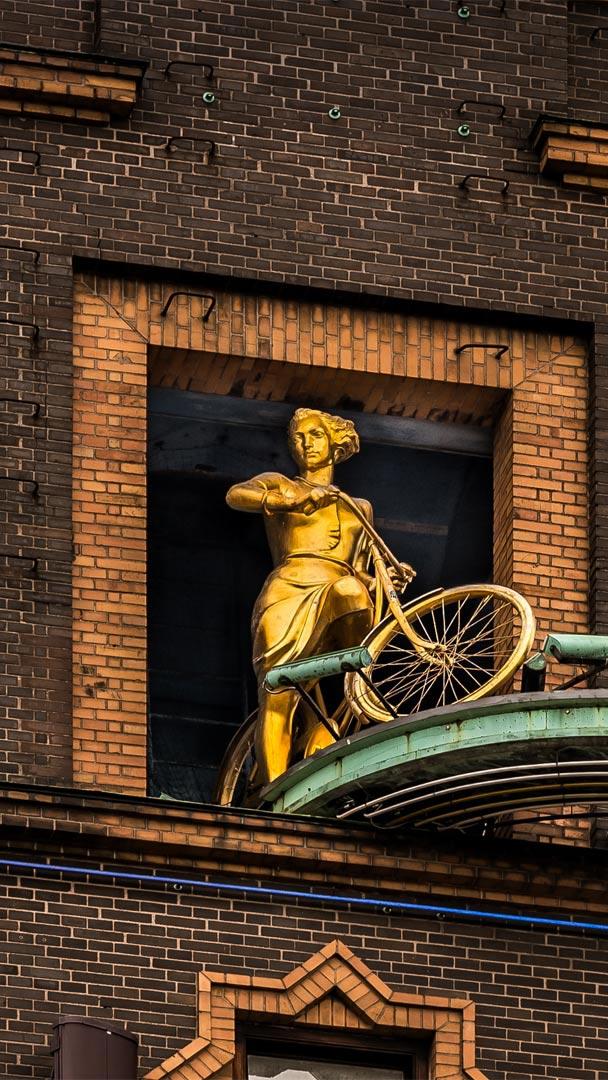 Perfect day for a ride Vejrpigerne (The Weather Girls) sculpture on top of the Richshuset building in City Hall Square in Copenhagen, Denmark (© Stig Alenas/Shutterstock)