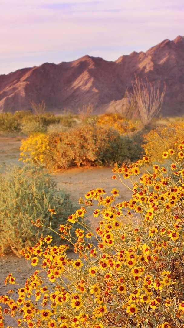 You know you"re in the Sonoran Desert, Arizona, USA, when the sun gives you a warm "welcome"! This arid land is home to various animals such as roadrunners, Gila monsters and the Morafka"s tortoise. The Sonoran Desert experiences two rainy seasons, which leads to the blossoming of colourful wildflowers such as the brittlebush, seen in today"s image. These hardy shrubs seen here are adapted to the dry climate, with their silvery-grey leaves covered in fine hairs that help reduce water loss through transpiration. Brittlebushes produce bright yellow flowers that bloom in clusters at the ends of their branches, adding a splash of colour to the desert landscape. Another drought-loving desert flora is the saguaro cactus, which can live for over 150 years and grow up to 12 metres tall. These cacti offer food and shelter to desert species. The saguaro is also a sacred plant in the culture of the Tohono O"odham people, used for sustenance and rituals.