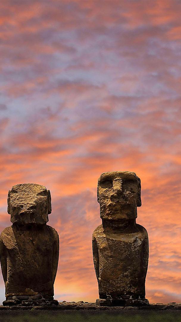Roam around tiny, remote Easter Island and you"ll find almost 900 of the stern stone faces called moai. They seem ancient as the pyramids, even a little alien, but they were actually sculpted between 500 and 800 years ago from compacted volcanic ash that"s as terrestrial as it comes. You"re seeing six of the 15 moai that stand on Ahu Tongariki, the largest ahu (stone platform) on the island. These statues were toppled in the 18th or 19th century along with other moai island-wide for reasons not fully known to scholars, though earthquakes or possible tribal infighting are postulated. The statues were later buried by a tidal wave and lay in ruins until the 1990s, when they were excavated and placed back on the ahu.