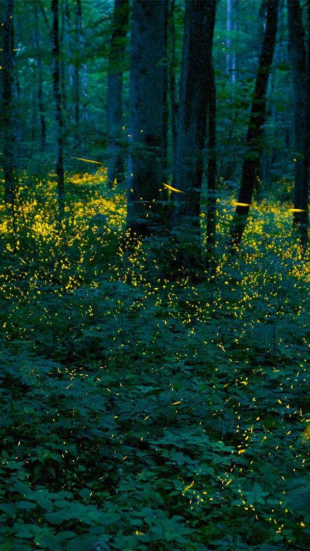 Every year between late May and mid-June, synchronous fireflies gather into a sparkling, rhythmic light show in the forests of Great Smoky Mountains National Park. As part of their two-week mating display, the female lightning bugs synchronize their flashes with nearby males so that every few seconds waves of light ripple through the woods. Of at least 19 species of fireflies that live in Great Smoky Mountains National Park, Photinus carolinus is the only species with synchronous light displays, but they can also be found in Allegheny National Forest in Pennsylvania and Congaree National Park in South Carolina. Other species of synchronous fireflies are particularly prevalent in Southeast Asia.
