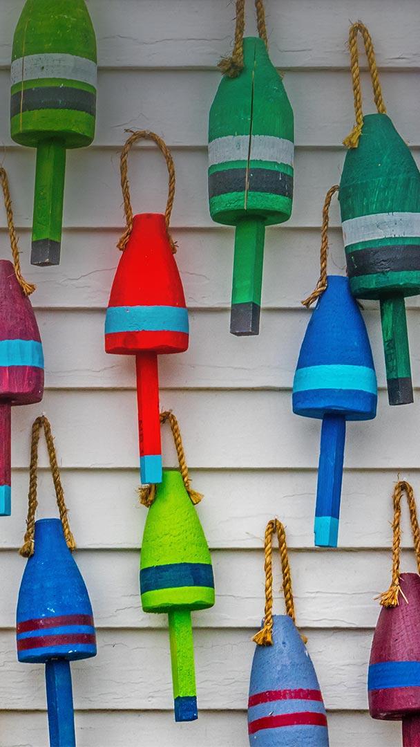It"s peak lobster season in Maine, and colorful wooden buoys like these are marking lobster traps (or "pots") along the state"s coastline. Each lobsterman or woman has a unique color and pattern to their buoys, and designs are frequently passed down through generations. When not being put to use, lobster buoys are often hung from the sides of barns and sheds—they"re an iconic sight in coastal Maine.