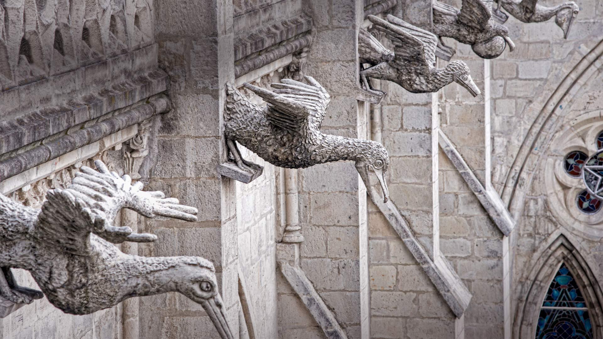 "Goofy" might be a better descriptor, but these seabird statues lining an outer wall of an Ecuadorian cathedral are called "grotesques"—the architectural term for a statue ornamenting the side of a building. But hang on…don"t we call those "gargoyles"? Not exactly. Gargoyles are simply grotesques that boast a specific, practical feature: spouts that convey water from rain gutters away from the building.