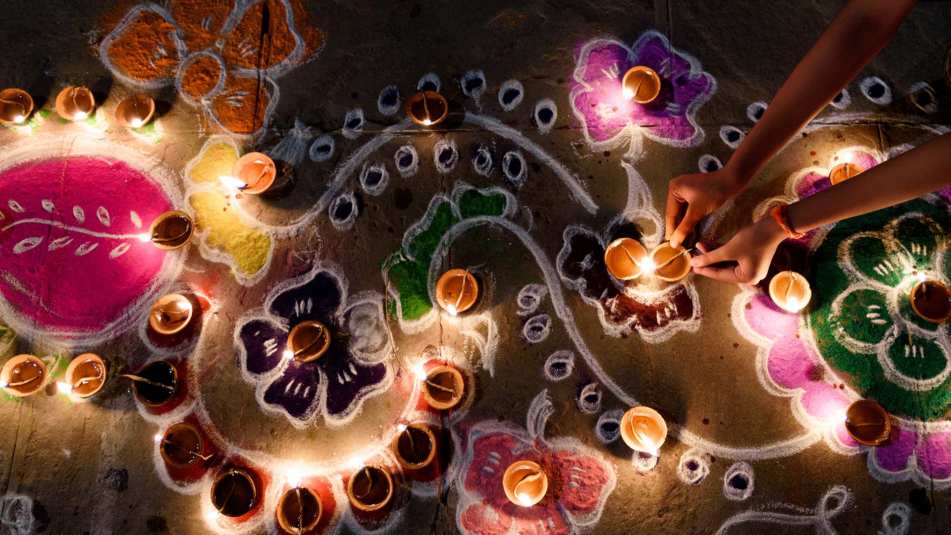 During Diwali, the five-day festival of lights, vibrant patterns of all shapes and sizes are created on the floor out of materials such as colored rice, sand, and flower petals. The charming Indian folk art, called rangoli, is usually made near the entrance of a home to welcome guests and deities, and is said to bring good luck on special occasions. Celebrations might be a bit different this year, but buildings will still be brightened by these decorative drawings, twinkling lights, and small oil lamps, known as diyas.