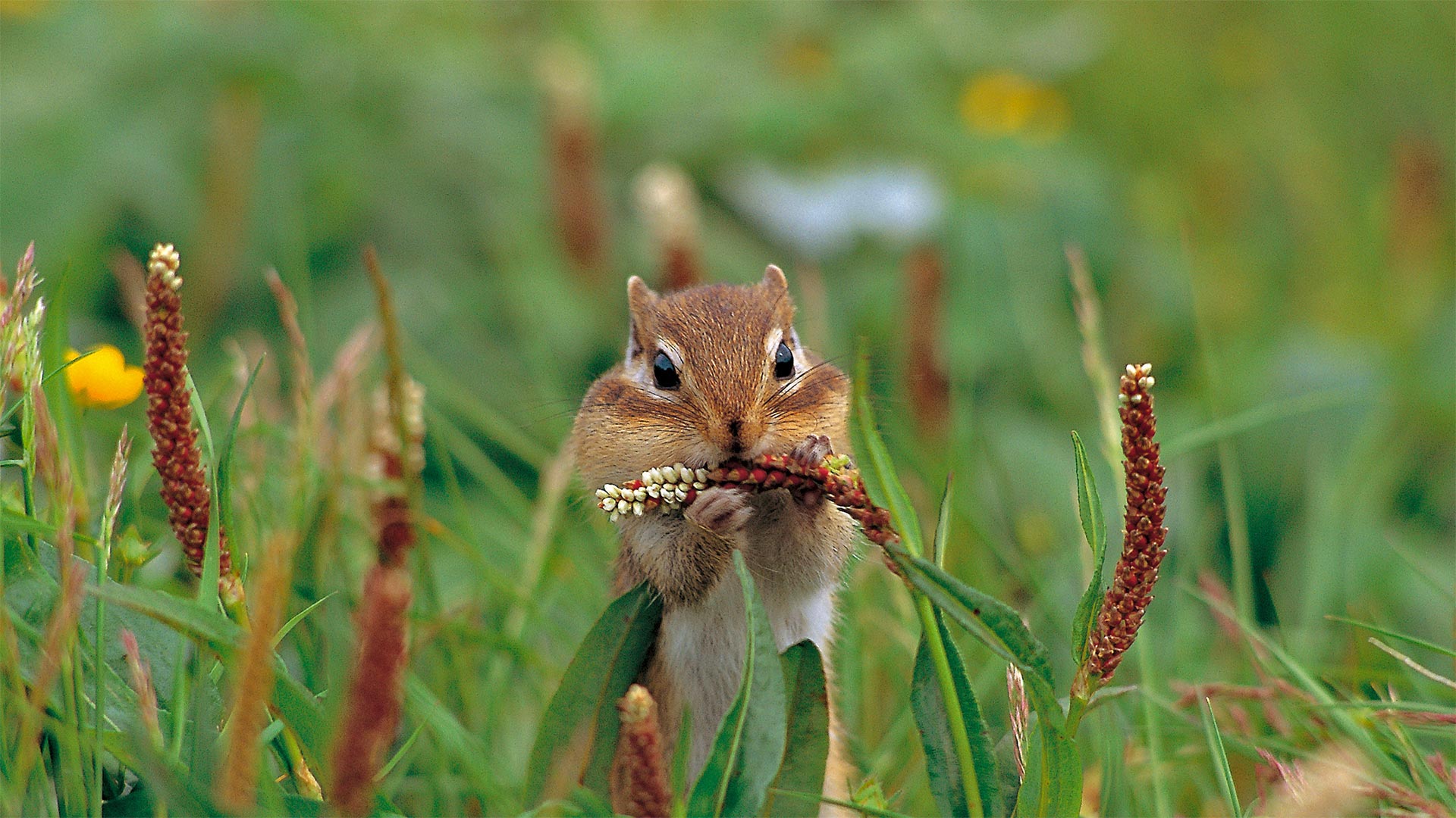 The Siberian chipmunk is the only species of chipmunk found outside of North America. Its native habitat ranges from across Russia to northern China, Japan, and Korea. Though Siberian pine nuts are a favorite meal, these little rodents will eat nearly anything—seeds, fruits, insects, even small birds and lizards. Our ravenous friend here in Hokkaido, Japan, is gorging on inflorescences, or clusters of flowers. A chipmunk can stuff a surprising amount of goodies into its cheek pouches, which can stretch to three times its head size—imagine how ridiculous we"d look if our stomachs were as forgiving.
