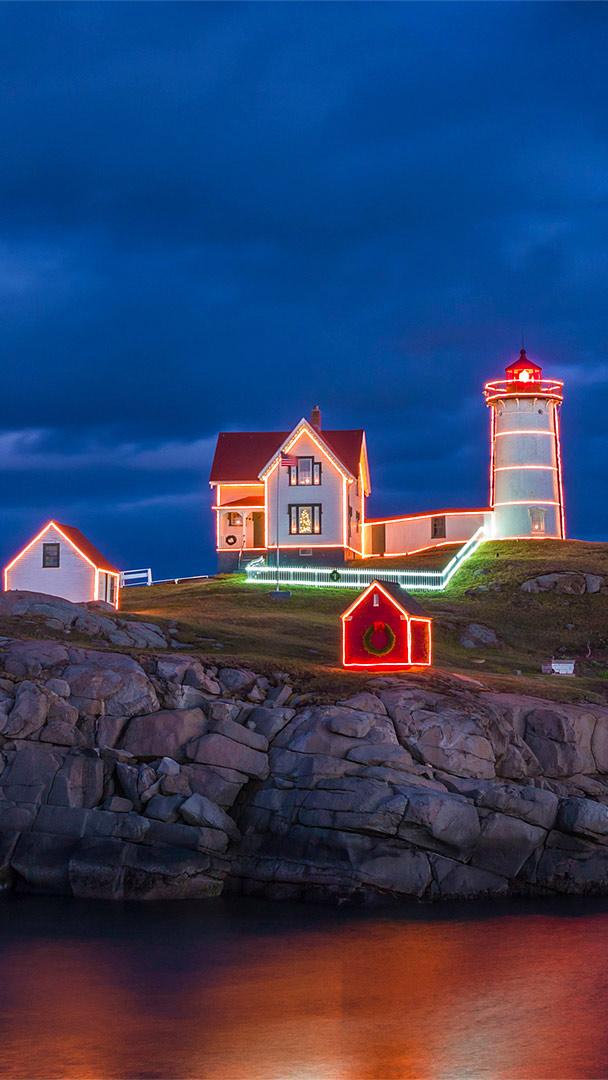 This classic New England scene is Cape Neddick Light, one of the most iconic of Maine"s 65 lighthouses, all lit up for the holiday season. Built on more than 2 acres of granite island, the Nub has been protecting sailors since 1879. It"s a tradition for locals to visit when it"s dressed up for the holidays. And if you miss the winter display, you can come back in July, when the lighthouse is relit for summer visitors.