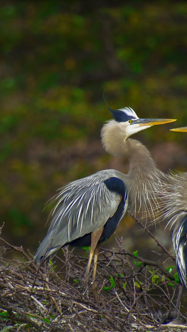 Take a stroll through the Wakodahatchee Wetlands and you"ll likely spot great blue herons, like the fluffed-up pair we"re featuring today. Located in Delray Beach, Florida, and created on 50 acres of wastewater utility property, the park first opened to the public back in 1996. A three-quarter-mile boardwalk takes visitors over ponds and through marshes, offering the chance to see more than 150 bird species, plus turtles, fish, frogs, alligators, and other Floridian fauna. Every day, the Palm Beach County Water Utilities Department pumps about 2 million gallons of highly treated wastewater into the wetlands. Then algae and other plants naturally finish the purification process before the water seeps back into the water table. Quite an upgrade from a yucky wastewater pond.