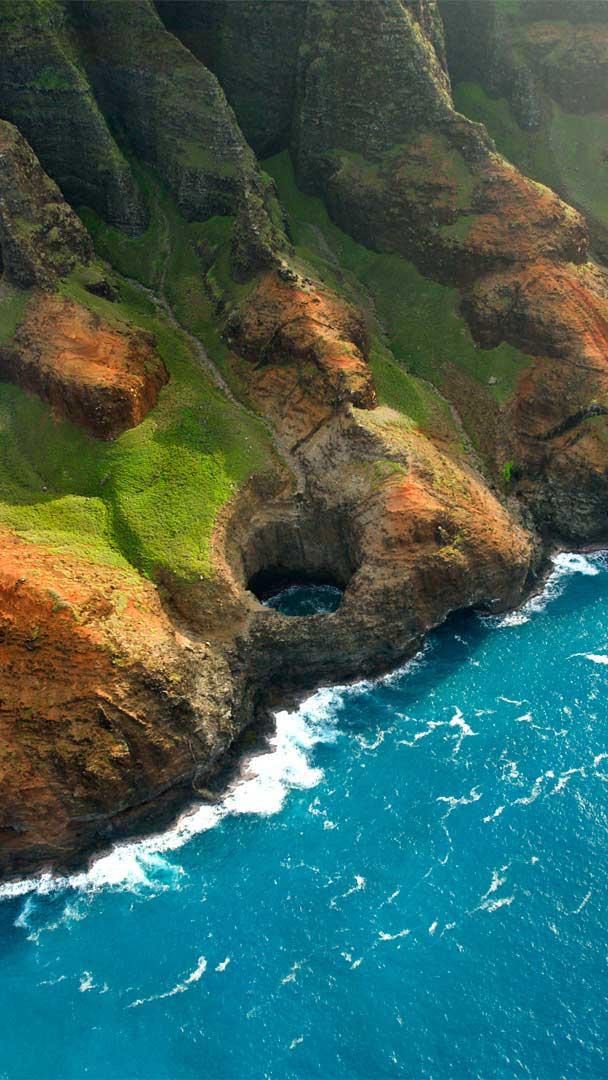 It takes some effort to reach the stunning Nā Pali Coast on the Hawaiian island of Kauai. Located on the island"s northwest side and stretching about 16 miles, Nā Pali isn"t accessible by car. You have to hike in, fly in by helicopter, or come at it from the sea by boat. In the summer, when the waves are calm, you can explore the rugged coast by kayak, but you"ll need a solid supply of muscle power for the sometimes-grueling paddle. If you seek a gentler approach—and if COVID restrictions allow—book a boat trip to explore the interiors of the sea caves that dot the shore. Today, we"re looking down on the Bright Eye sea cave, one of several caves on the Nā Pali Coast that lost their ceilings to the pounding of the sea.