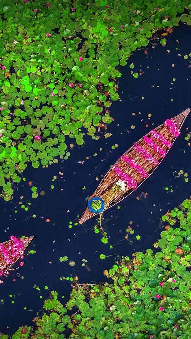 There may be a more peaceful, stress-free job somewhere, but we wager that the farmers harvesting water lilies and gliding along the river in Satla, Bangladesh, might have that locked up. The flowers bloom during the seasonal flood from August to November, cloaking an incredible 15 square miles of wetlands in gorgeous, fragrant pink. The village of Satla, in the Barisal District of south-central Bangladesh, is known as the capital of "shapla," or water lilies, for obvious reasons.