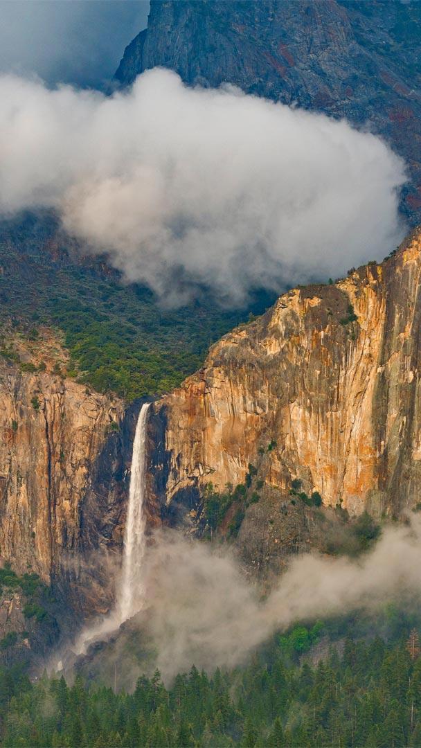 There are thousands of waterfalls in Yosemite National Park, but perhaps none are as well known as Bridalveil Fall. First things first: Don"t call it "falls" because then someone may think you were in Utah where another waterfall bears the surprisingly similar name, Bridal Veil Falls. Bridalveil, as seen in the photo, is often the first waterfall visitors to Yosemite encounter. It plunges 617 feet and flows year-round, fed with water from Ostrander Lake nearly 10 miles away. When the flow is light, brisk winds blow the water sideways. That"s why the Ahwahneechee Native Americans, who have lived in the Yosemite Valley for centuries, traditionally called the waterfall Pohono, or "Spirit of the Puffing Wind."