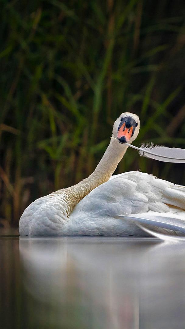 The mute swan is a symbol of beauty and elegance, thanks in no small part to the beloved fairy tale "The Ugly Duckling," about an awkward and unsightly duckling who upon growing up discovers he is actually a swan. The proverbial story is often used as a lesson in transformation and the relative nature of beauty. One glance at this swan, seen here holding a feather in a nature preserve in the Netherlands, and it"s easy to see how the idiom "graceful as a swan" came about.