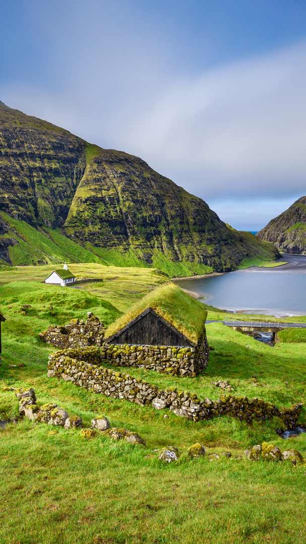 Nestled in a picturesque valley next to a lagoon flanked by mountains, Saksun is a small, remote village famous for its stunning vistas. It is situated on the coast of Streymoy in the remote Faroe Islands, which sit about halfway between Iceland and Scotland in the North Atlantic. Home to these iconic houses with turf roofs and a tiny population—estimates vary between 8 and 30—it is said that there are more waterfalls in Saksun, than houses.