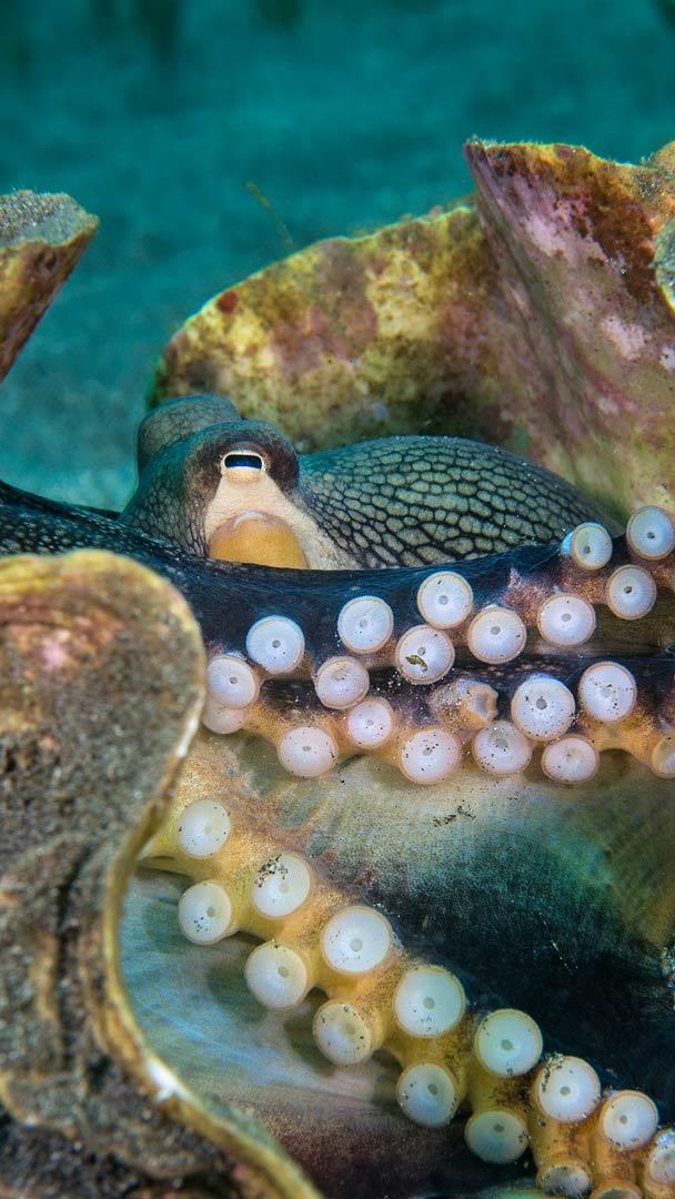 What exactly are we looking at here? The veined octopus, also known as the coconut octopus, is one of the smartest animals on Earth, building shelters from seashells and coconut shells. If you peek inside, you may spot those telltale suction cups that cover the creature"s eight limbs. These arms contain clusters of neurons, which make them particularly sensitive, and each arm can be used separately to perform complex tasks. Octopuses can also match the color—sometimes even the texture—of their environment, making them even more difficult to spot. There"s lots more to learn about these fascinating animals, and World Octopus Day is a great day to do it. You could always start with the Academy Award-winning documentary "My Octopus Teacher."