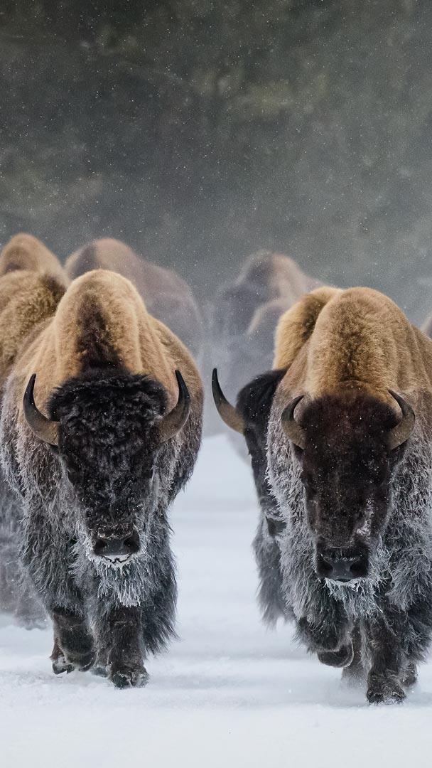 When temperatures plunge, the American bison couldn"t care less. These burly mammals are ready for snow with their shaggy coats and massive bodies weighing up to 2,000 pounds. Our homepage bison are pictured in Yellowstone National Park in Wyoming, home to one of the largest and oldest herds in the country. Bison have roamed here since prehistoric times.