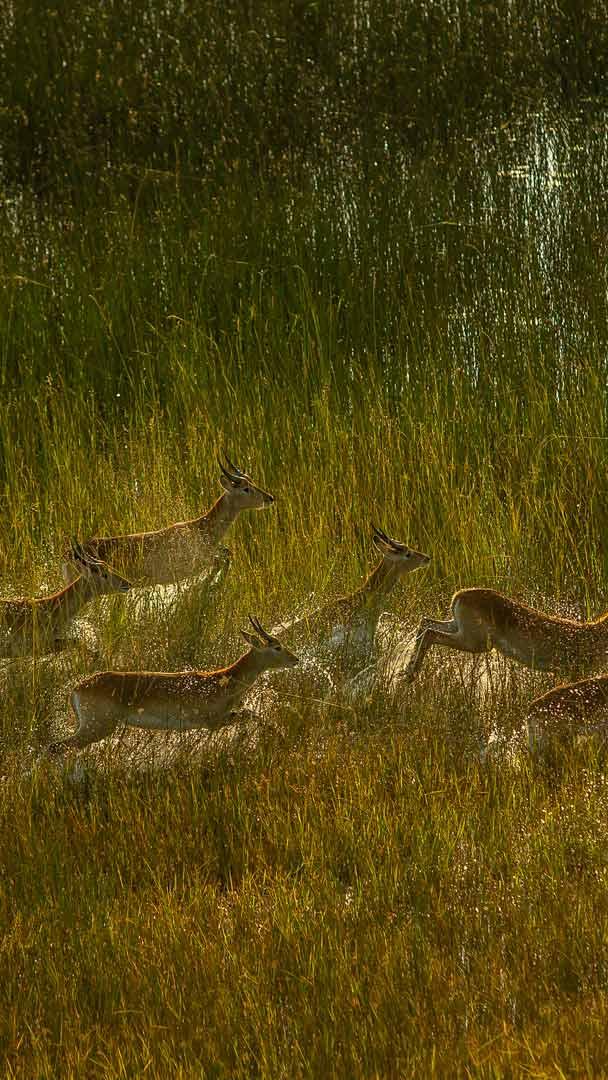 With their elegant leaps and graceful movements, lechwe are the epitome of agility and poise on the African savanna. These antelopes, known for their distinctive reddish-brown coats and lyre-shaped horns, are native to the wetlands and floodplains of south-central Africa, including the Okavango Delta in Botswana, which is a UNESCO World Heritage Site. Lechwe are social animals, often found in herds of thousands. In the heart of the delta, they are an integral part of the region"s rich biodiversity, coexisting with other species like elephants, lions, rhinos, and hippos, wading through the water. Their presence adds to the delta"s natural allure, which draws in thousands of safari enthusiasts, and is proof of wildlife"s resilience in the face of environmental challenges.