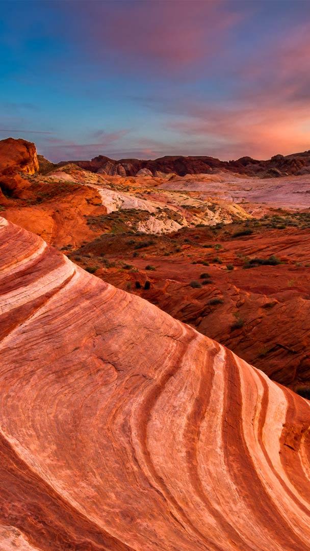 Amid the arid expanse of the Mojave Desert in Nevada lies Valley of Fire State Park. Named after its red Aztec Sandstone, an Early Jurassic formation made from ancient sand dunes, the park stretches across 46,000 acres. Featured on our homepage is one of its highlights, Fire Wave, a geological marvel that appears like a frozen wave with its red, pink, and white stripes.
