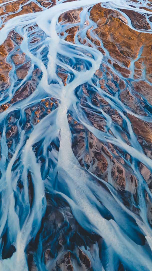 Iceland"s glacial rivers have shaped the landscape here in the land of fire and ice over thousands of years. The rivers seen in today"s image are formed from the meltwater of vast glaciers like Vatnajökull, Langjökull, and Hofsjökull. Vatnajökull, the largest ice cap in Iceland, covers over 3,000 square miles—approximately 10% of the country"s landmass. As the glaciers melt, the water carries fine sediments, creating a braided river system with a milky appearance that contrasts with the earthy tones of the volcanic terrain. Every spring and summer, the rivers swell with seasonal meltwater, continually shaping and reshaping the land. Aerial views reveal their intricate patterns, interwoven across the terrain toward the North Atlantic Ocean. The water also powers hydroelectric power stations, reinforcing Iceland"s status as a leader in sustainable energy.