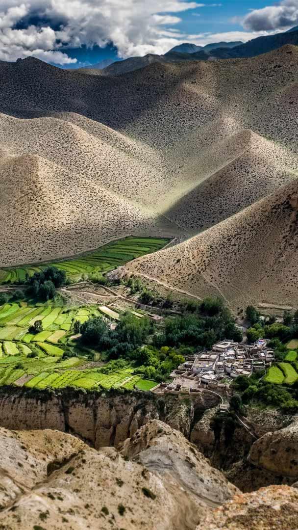 If you’re lucky enough to be one of the thousand or so tourists allowed into Upper Mustang each year, spring and autumn are the best times for trekking through this incredibly dramatic landscape. Tucked into a remote region of Nepal, it’s geographically part of the Tibetan Plateau. The area is surrounded by the Annapurna and Dhaulagiri Massifs and marked with deep gorges, terraced fields, and colorfully stratified rock formations. But perhaps most fascinating of all are the sky caves, 10,000 or so caves dug into the sheer walls of valleys in several areas of the district. Some of these man-made caves are thought to be ancient burial chambers; others are richly decorated with valuable Buddhist paintings, sculptures, and artifacts from the 8th to the 14th centuries. Perched over 150 feet above the valley floor, no one is entirely sure how the caves were built, what they were used for, or even how people accessed them.